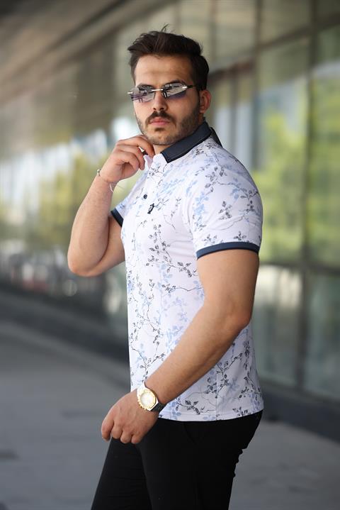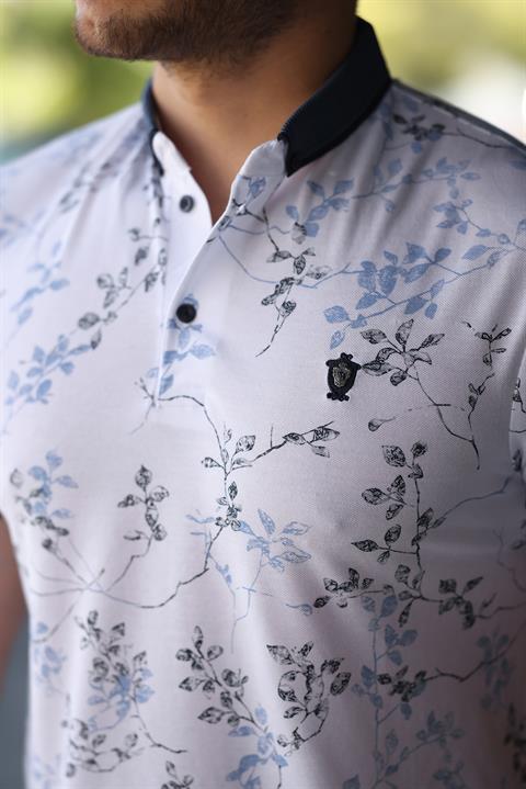 Erkek Beyaz Mavi Yaprak Desenli Slim Fit Polo Yaka Tişört - 2529