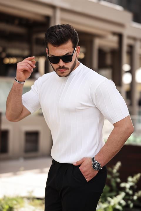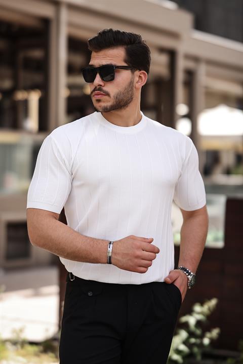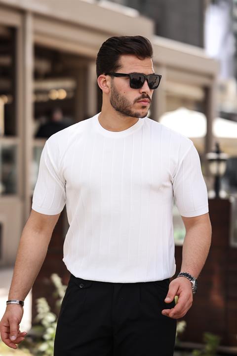 Miron Beyaz Sıfır Yaka Kabartma Triko Kısa Kollu Tişört- 2430