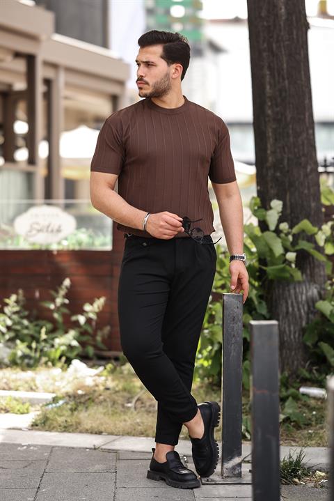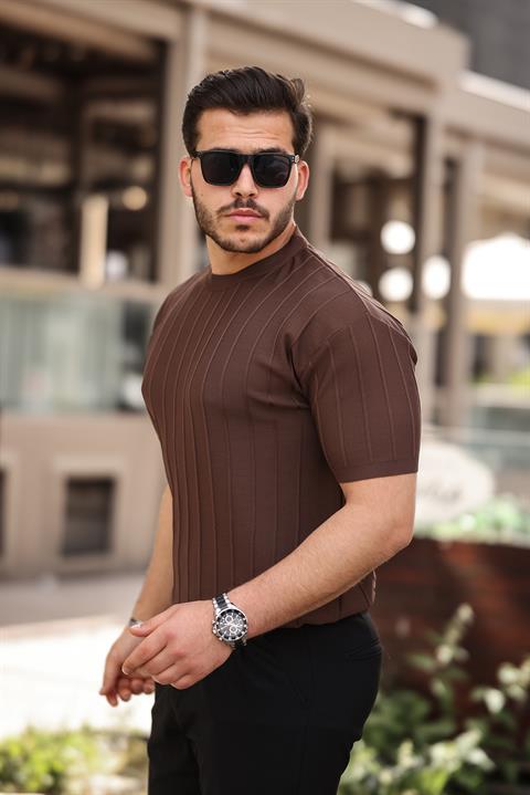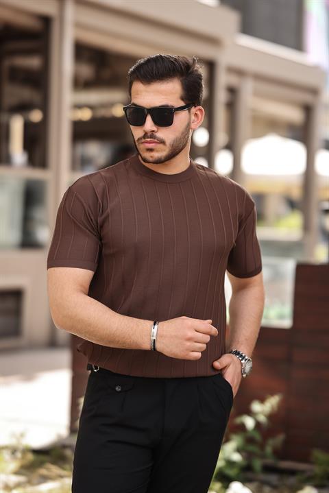 Miron Kahverengi Sıfır Yaka Kabartma Triko Kısa Kollu Tişört- 2430