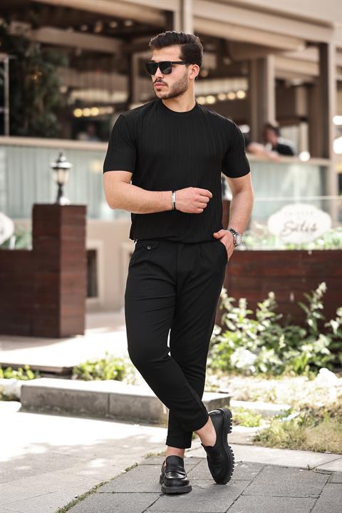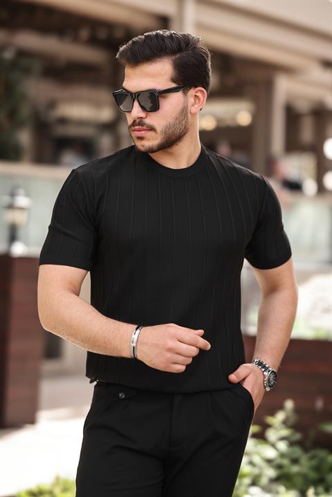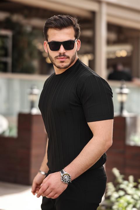 Miron Siyah Sıfır Yaka Kabartma Triko Kısa Kollu Tişört- 2430